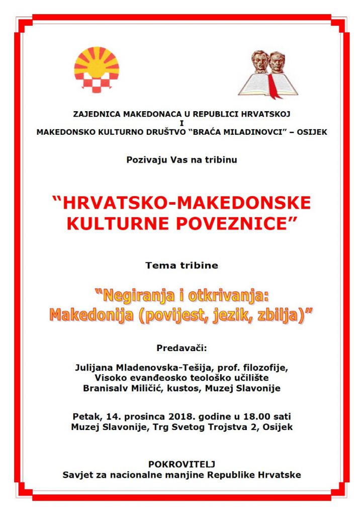 U petak, 14. prosinca 2018. u 18 sati, u Muzeju Slavonije, Trg Svetog Trojstva 2, Osijek, održala se Tribina “Hrvatsko-makedonske kulturne poveznice”. Tema predavanja: „Negiranje i otkrivanje Makedonije, jezika i identiteta“. Predavači su bili: Julijana Mladenovska-Tešija, prof. filozofije, Visoko evanđeosko teološko učilište u Osijeku i Branisalv Miličić, kustos Muzeja Slavonije.