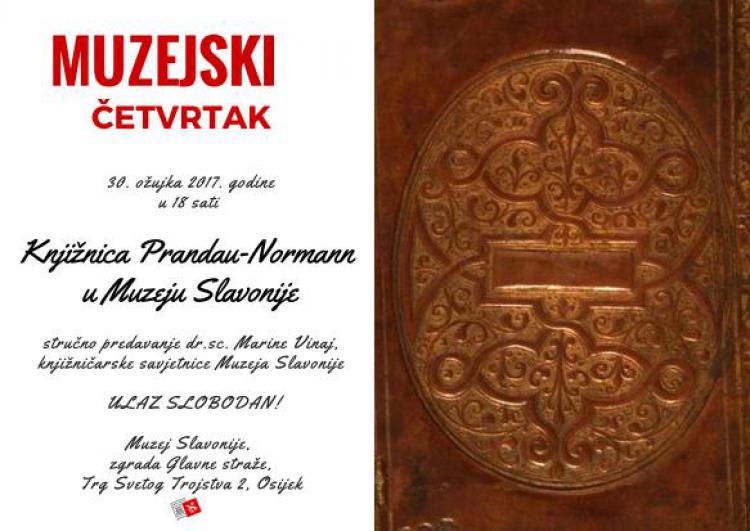Stručno predavanje ”Knjižnica Prandau-Normann u Muzeju Slavonije” dr. sc. Marine Vinaj, knjižničarske savjetnice Muzeja Slavonije, održat će se u sklopu Muzejskog četvrtka 30. ožujka 2017. u 18 sati, u Multimedijalnoj dvorani Muzeja Slavonije, zgrada Glavne straže, Trg Svetoga Trojstva 2, Osijek.