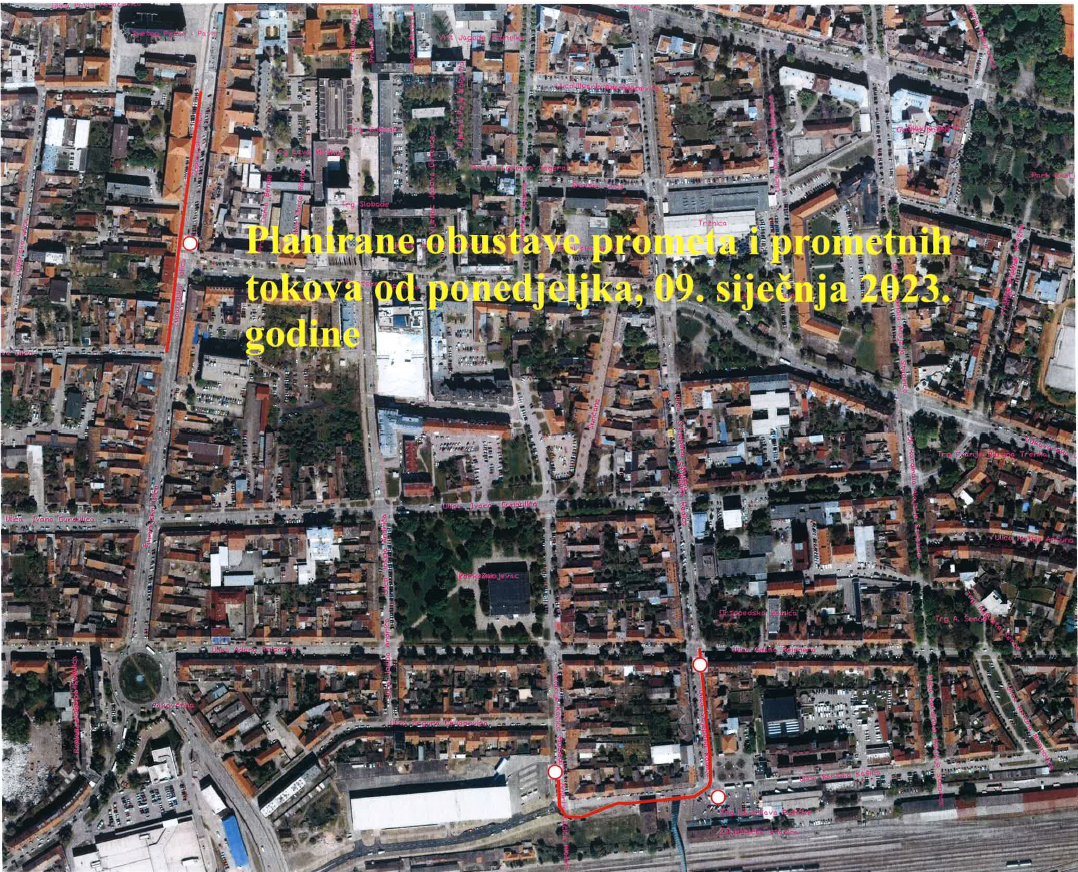 -djelomično se obustavlja promet kroz kružni tok „Đakovština“, prohodni ostaju pravci Vinkovačka cesta-Ulica Adama Reisnera (istok) i obrnuto, te Ulica Adama Reisnera (zapad)-Sv.L. B. Mandića (TC Spar) u razdoblju od 22. siječnja predvidivo do 1. ožujka 2023. godine.