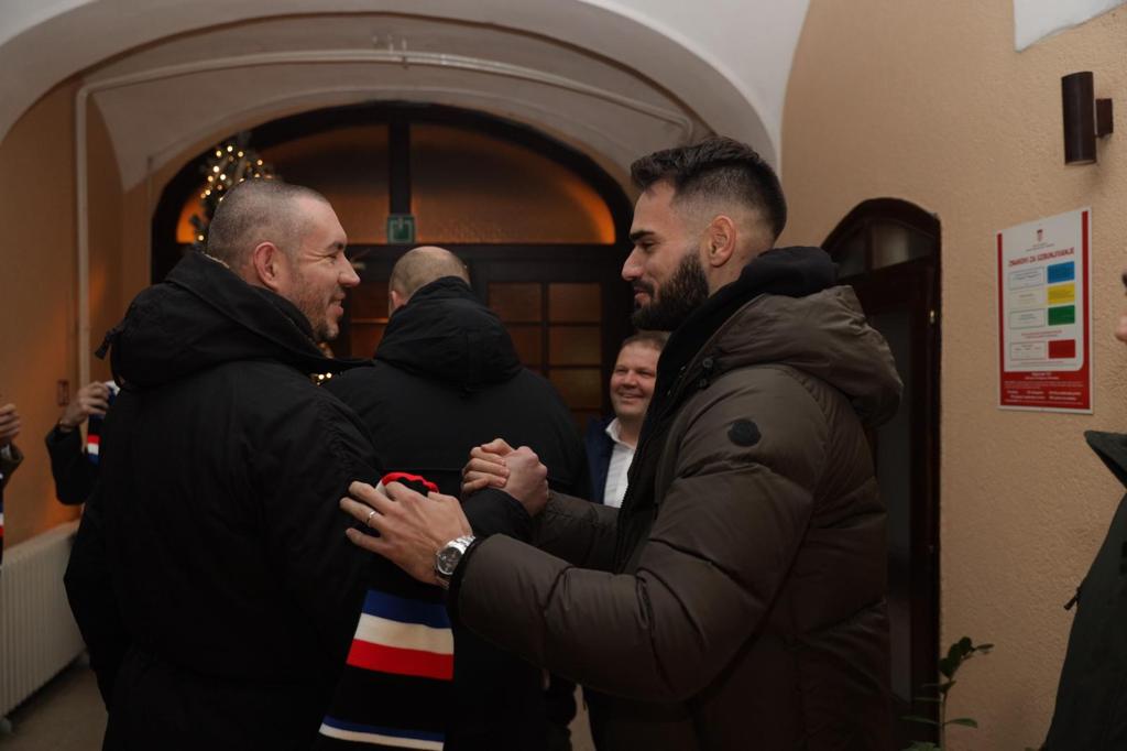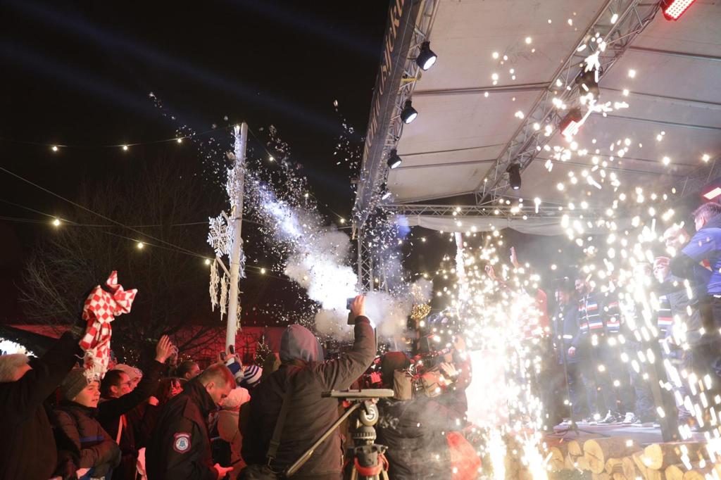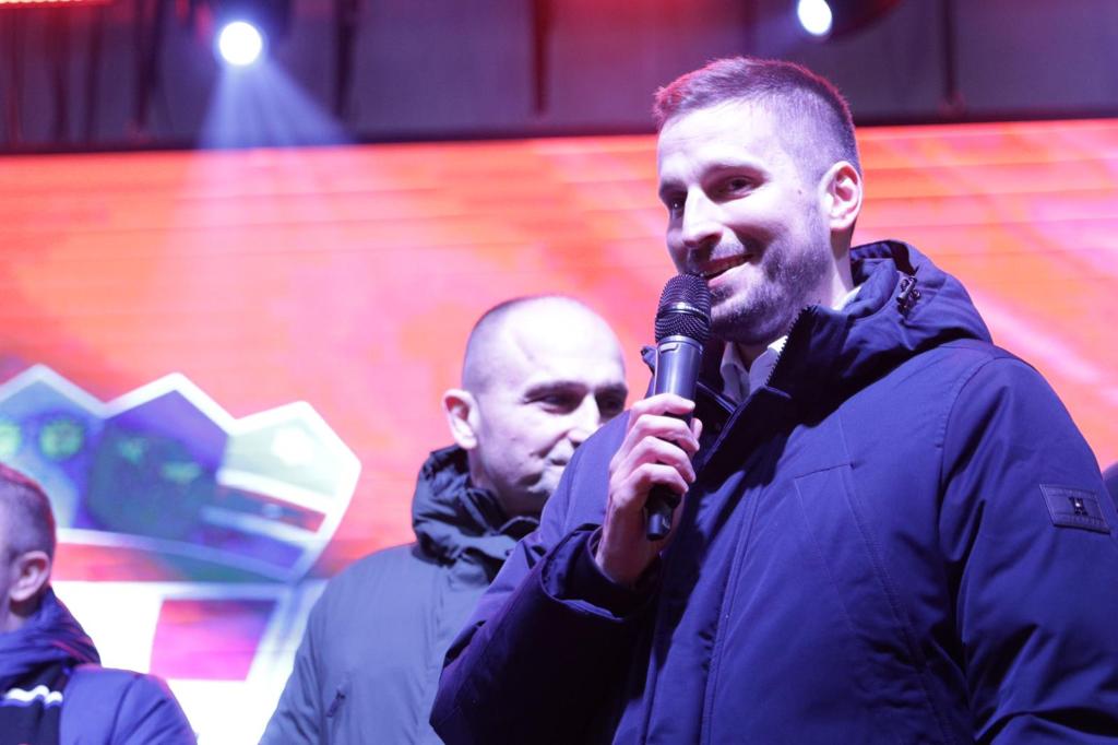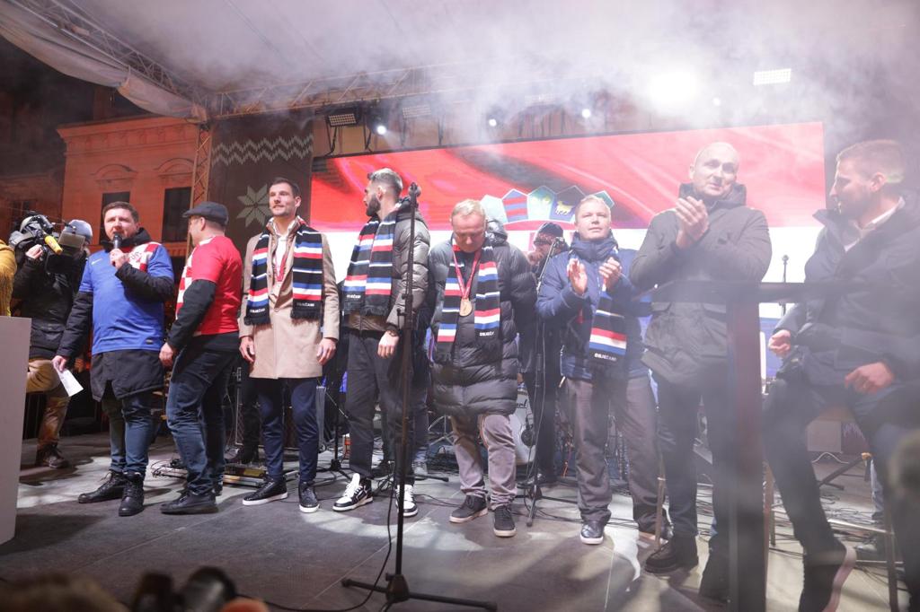 Brončana ekipa po dolasku na pozornicu odmah je zapalila atmosferu, koju su upotpunili dresovi, šalovi i ostali navijački rekviziti u prepoznatljivim crveno-bijelim kvadratićima. Na trgu u Tvrđi nastupali su Bosutski bećari, a sve je uveličao vatromet.