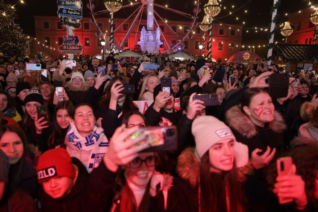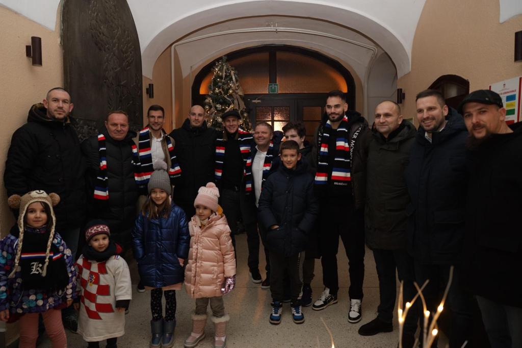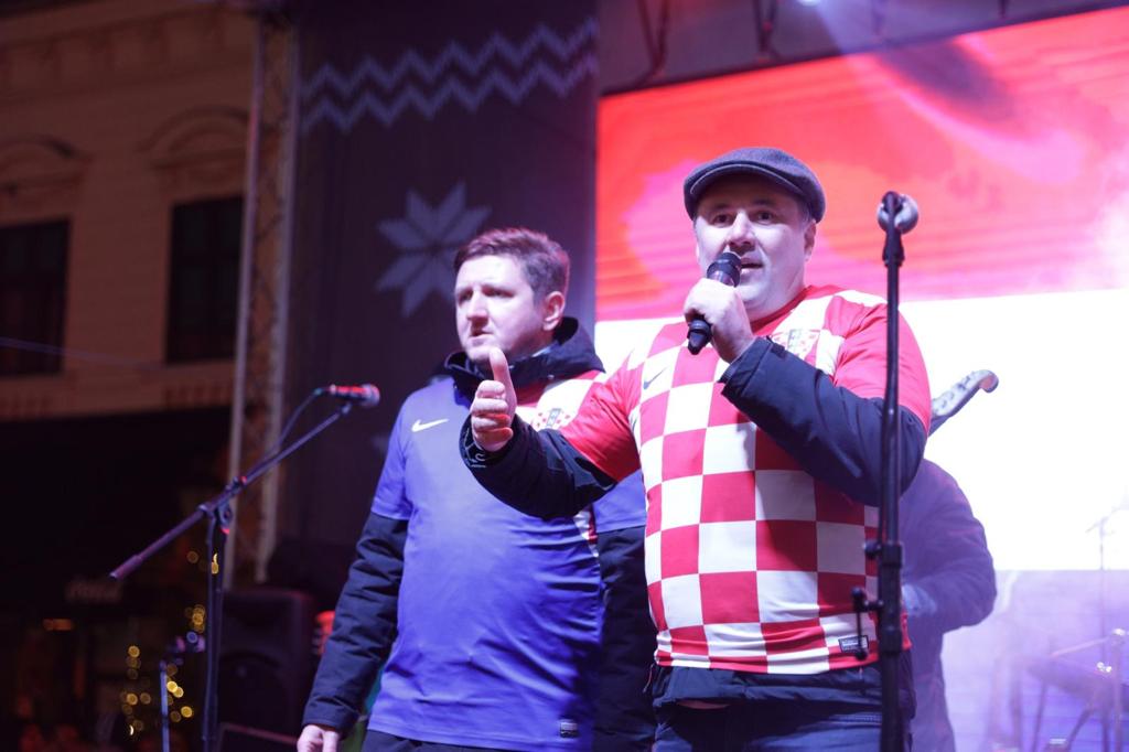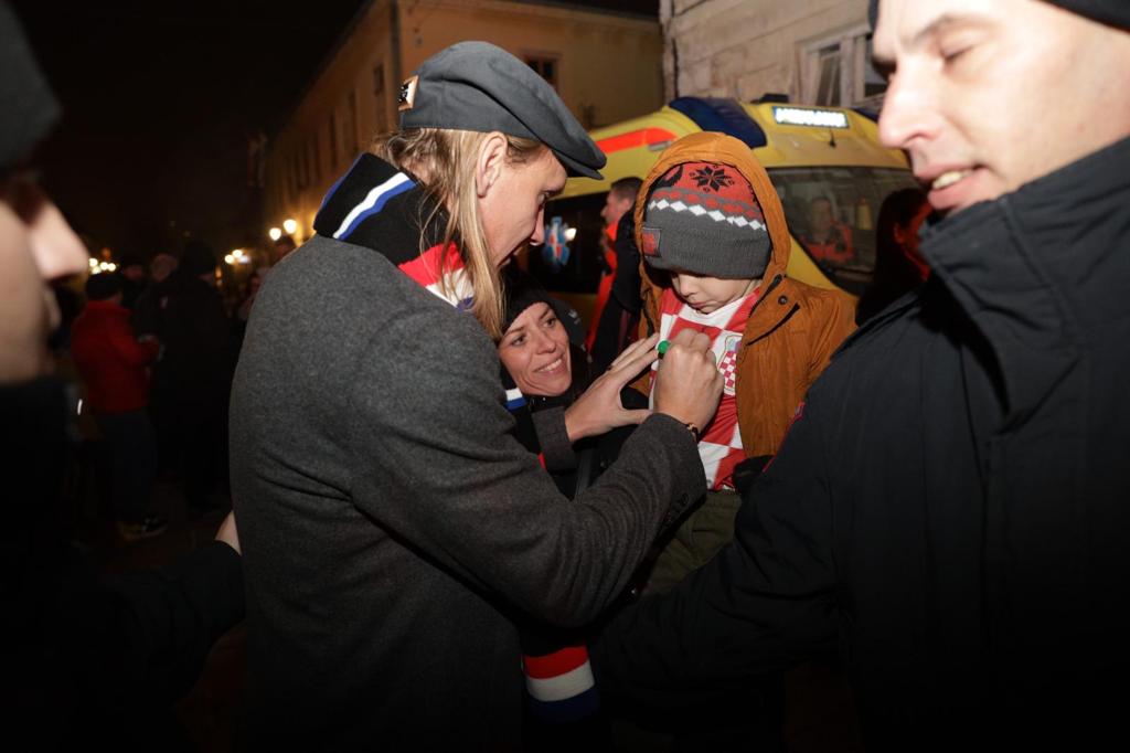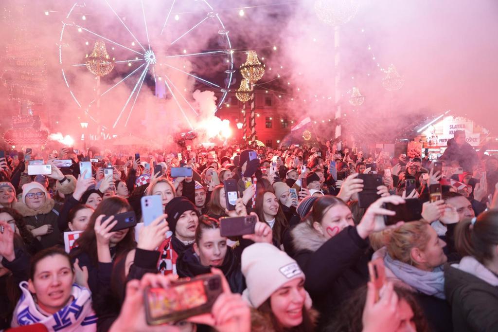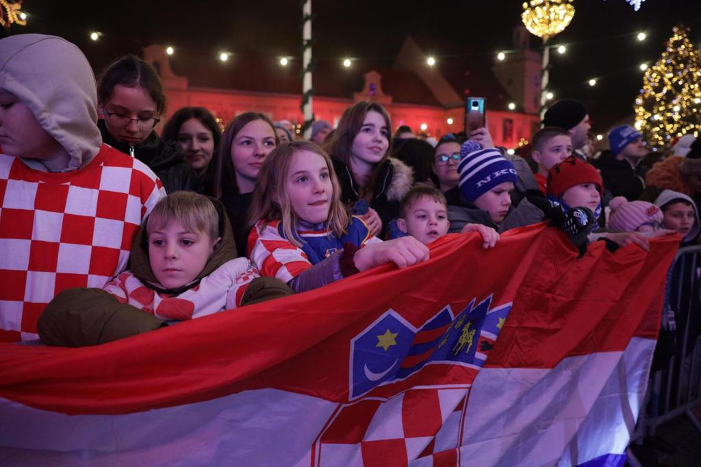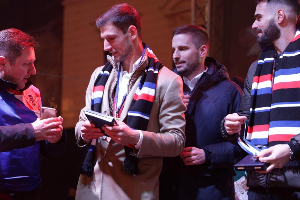 Mnoštvo sugrađana i navijača, među njima i osječki gradonačelnik Ivan Radić te župan osječko-baranjski Ivan Anušić, pljeskom, ovacijama i pjesmom na Trgu Svetoga Trojstva u Tvrđi pozdravili su sudionike velikog uspjeha hrvatske nogometne reprezentacije u Katru: Bornu Barišića, Domagoja Vidu i Ivicu Ivušića. Uz njih su bili i ekonom reprezentacije Goran Vincek te kuhar Tomica Đukić.